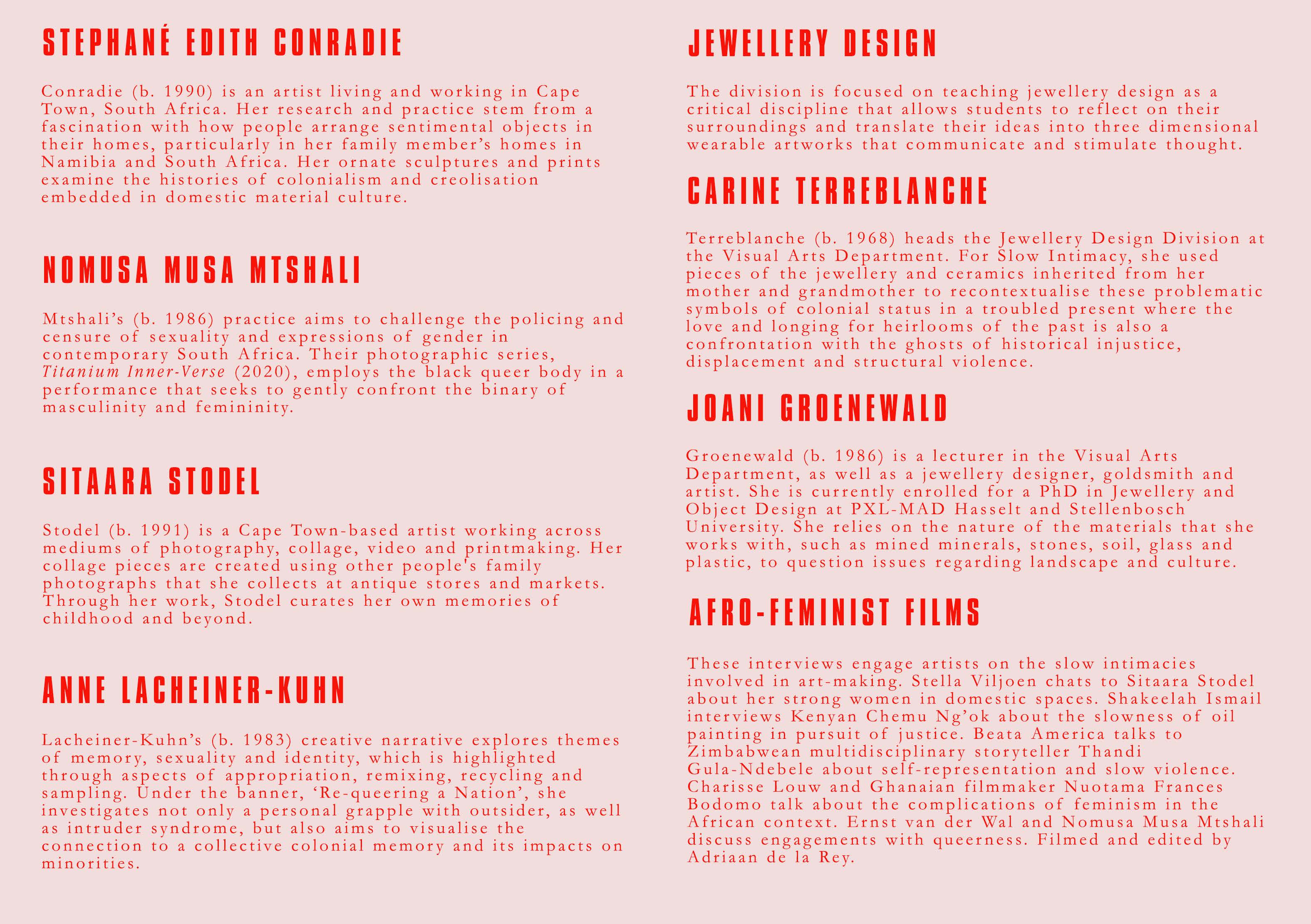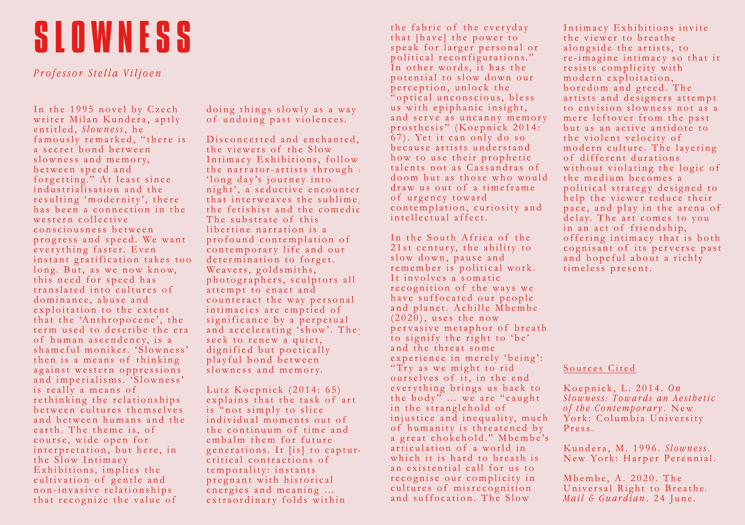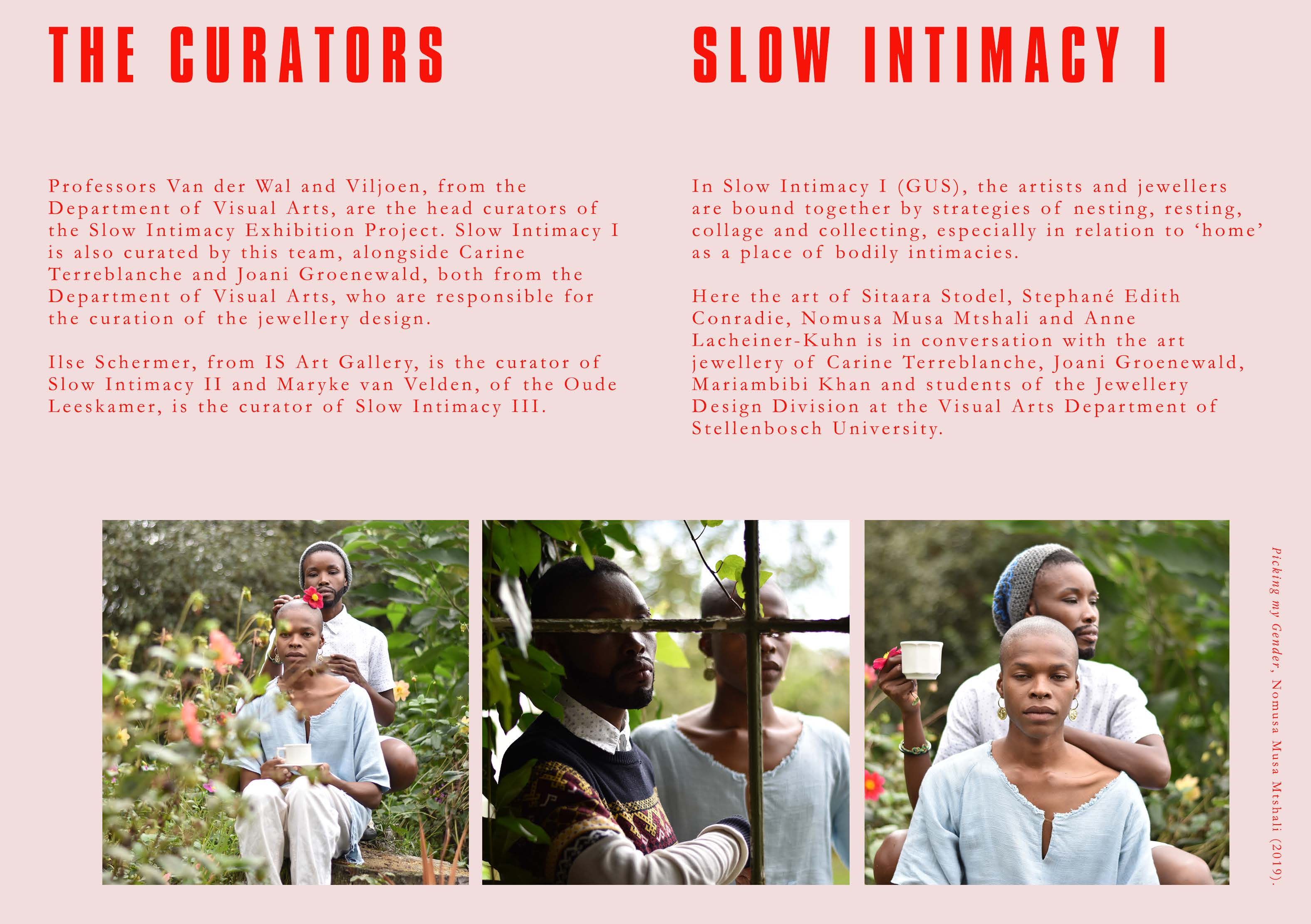 The Slow Intimacy Exhibitions reached across three Stellenbosch venues where various curators and artists considered the way art might be used to cultivate intuitive and constructive, but also subversive intimacies. The head curators were Prof Ernst van der Wal and Prof Stella Viljoen from the Visual Studies Team, Stellenbosch University.