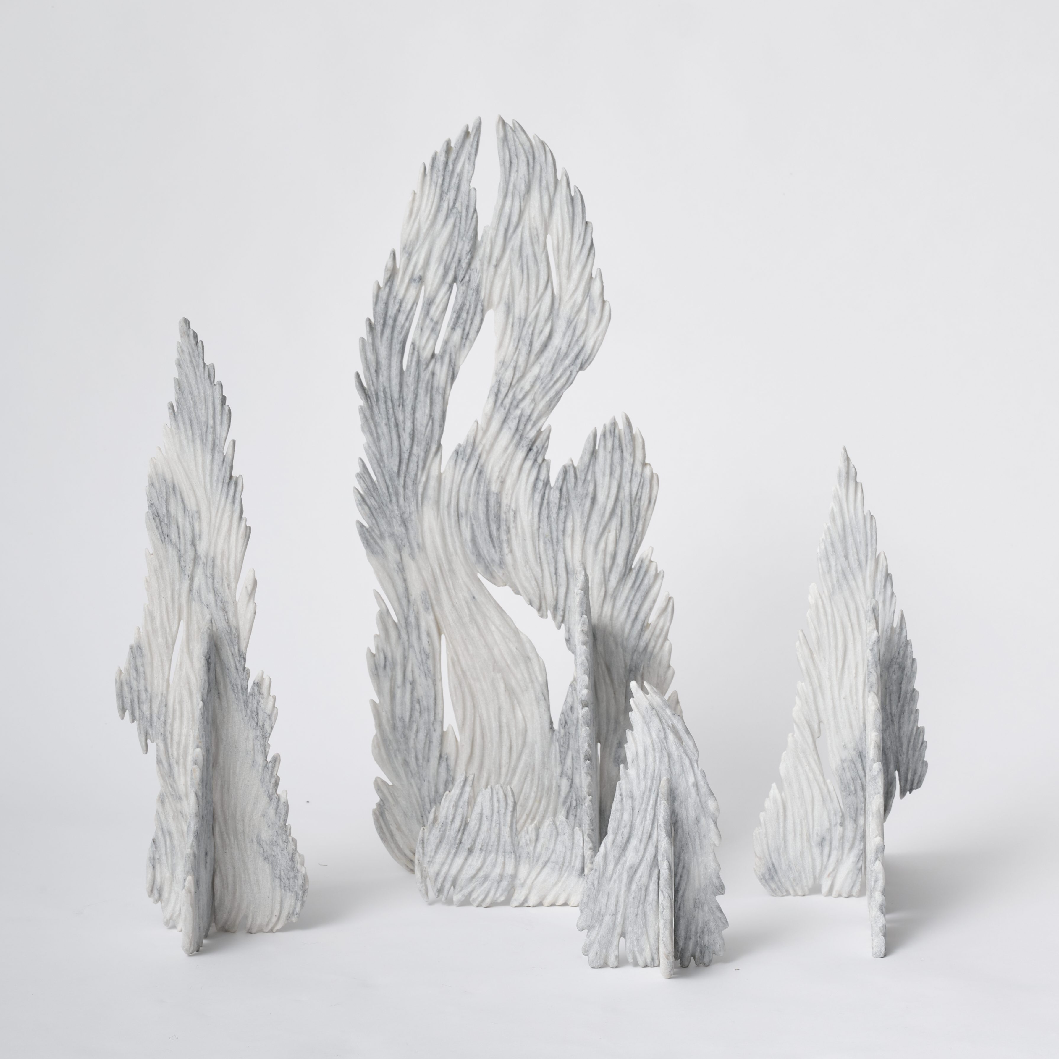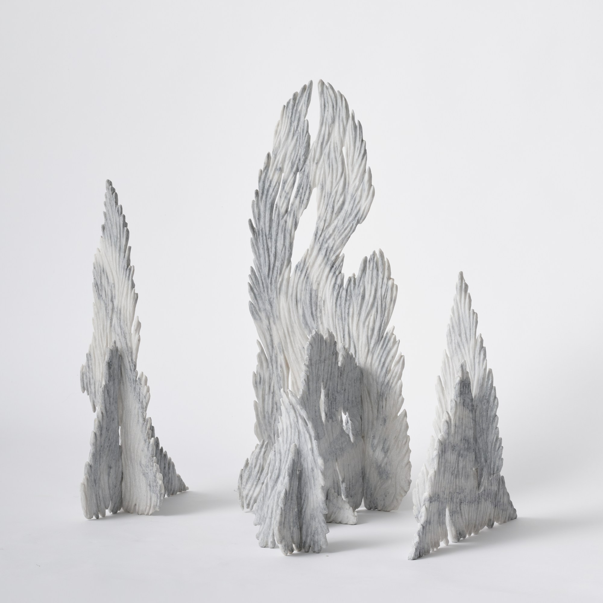 These pieces are inspired by rangeomorphs, ancient hybrid plant-animal organisms from the Ediacaran Period (635–541 million years ago), characterised by fractal branching patterns in which each sub-unit mimics the shape of the entire organism. My sculptures echo this logic, with serrated, flame-like edges giving volume and structure through their repetition.